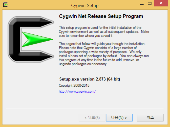 홈페이지 중간 쯤에 보면 https://www.cygwin.com/ 윈도우 32비트 용과 64비트용 설치 프로그램을 다운로드 받을 수 있습니다.