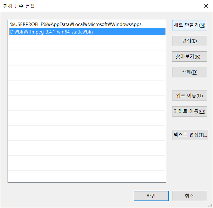 새로 만들기(N)... 누르고 좀 전에 ffmpeg를 다운로드해 압축을 풀어둔 경로에 \bin을 추가하여 입력