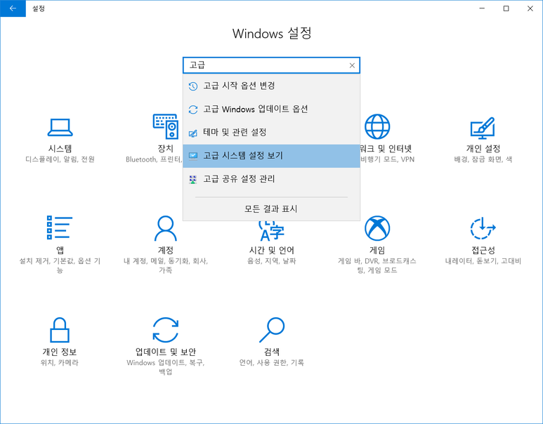 Windows 설정 창이 나타나면 설정 찾기에서 "고급 시스템 설정 보기" 검색해서 실행