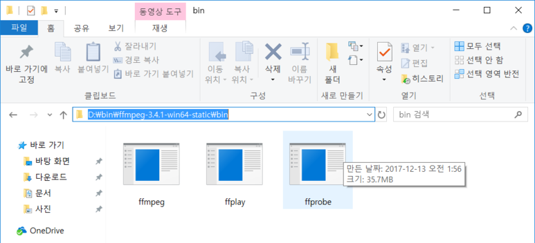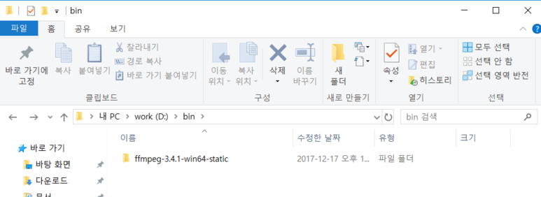ffmpeg의 경로가 D:\bin\ffmpeg-3.4.1-win64-static 라고 가정하고 설명에 들어가겠다.