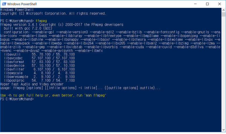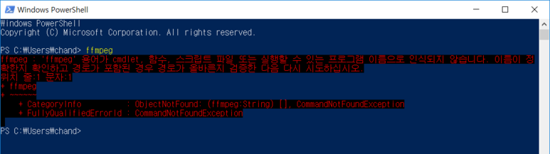 Windows PowerShell이 나타나면 ffmpeg 실행