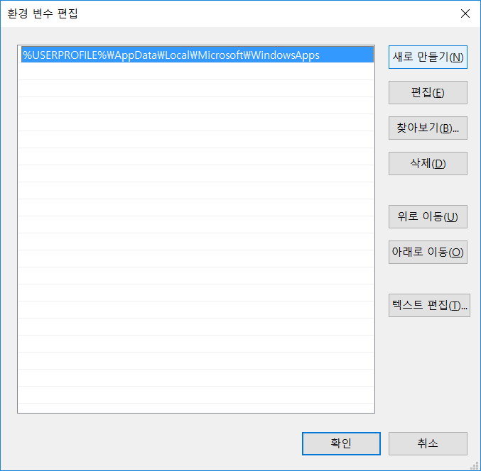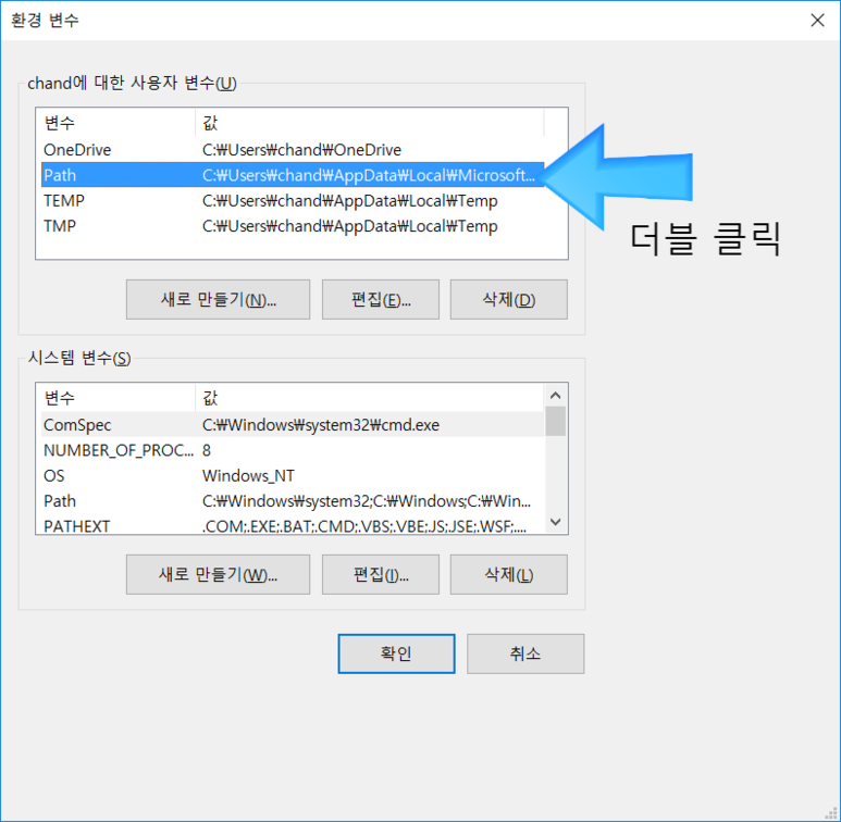환경 변수 창이 나타나면 Path 항목 더블 클릭 또는 Path 선택 후 "편집(E)..." 선택