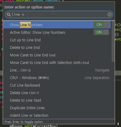 위 사진은 Find Action 활용 예이다. 소스 코드에 line number을 나타내고 싶은 데 어떻게 해야 하는 지 까먹었다. 그럴 때 Find Action 단축키를 누른 뒤 "line n"만 입력했는 데 "Show Line Number" 기능이 나타났다. 이렇게 Find Action을 통해 안드로이드 스튜디오의 기능에 접근할 수 있다.