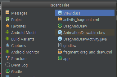 안드로이드 스튜디오의 가장자리 부분을 보면 툴 윈도우가 가려져 있다. 원하는 툴 윈도우를 보고 싶다면 Alt + 숫자를 누르면 된다. 숫자는 위 사진에서 파란색 동그라미 부분에 있다. 위 사진은 Alt + 7 을 눌러서 Structure 윈도우를 보게 했다.