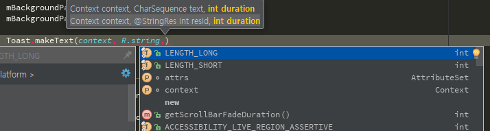 Toast.makeText의 세 번째 인자를 입력할 때 자료형에 따른 자동 완성 단축키를 눌렀다. int 형에 맞는 후보가 나오는 걸 볼 수 있다.