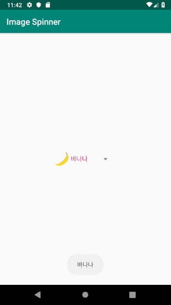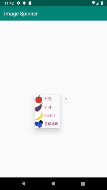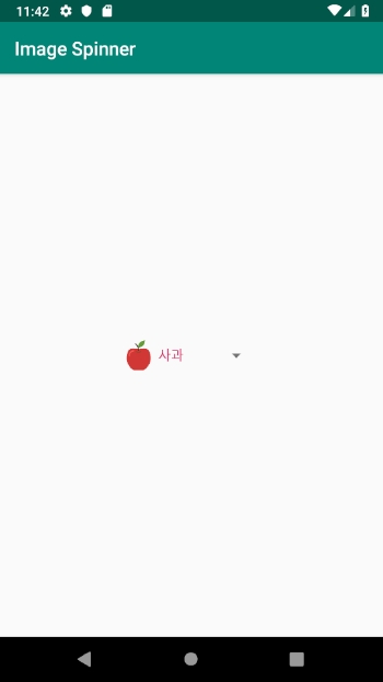 실행시키면 다음처럼 화면 중앙에 스피너가 보입니다. 디폴트로 사과가 선택된 상태입니다.