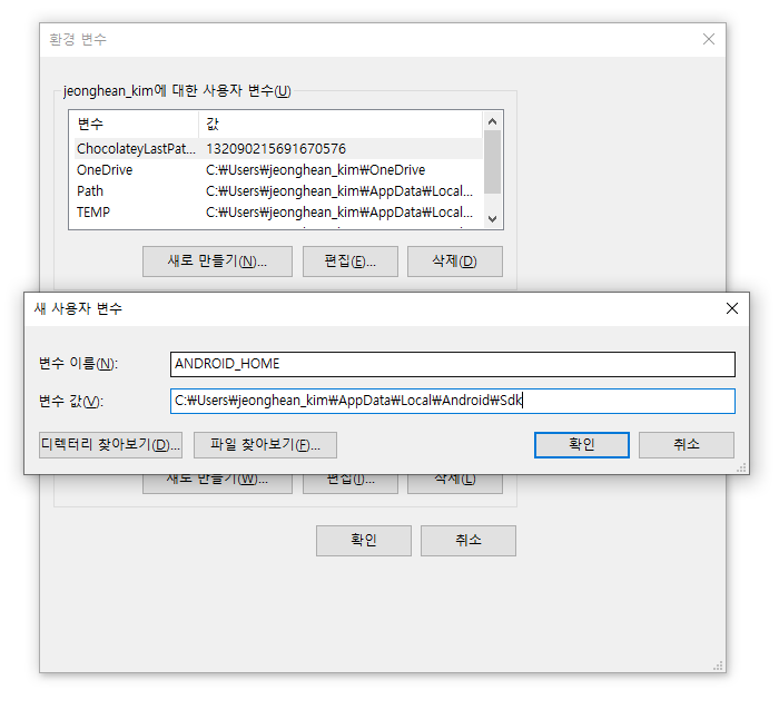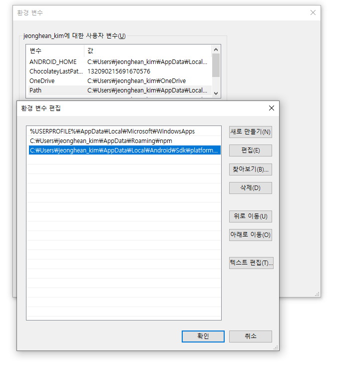 ANDROID_HOME 환경 변수를 추가하였다면, 안드로이드 스튜디오의 platform-tools를 설정해 주어야 합니다. 사용자 변수 리스트에서 Path를 선택하여 환경 변수 편집 화면으로 이동합니다.
