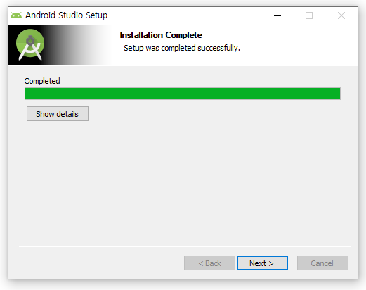다음 화면부터는 일반적인 소프트웨어의 설치 과정이므로 자세한 설명은 생략하도록 하겠습니다. Finish 버튼을 눌러 계속 진행하여 안드로이드 스튜디오의 설정을 완료합니다.