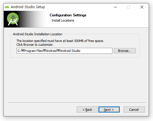 다음 화면으로 이동하면, 아래와 같이 안드로이드 스튜디오의 설치 위치를 설정하는 화면을 확인할 수 있습니다. 한글 이름이 포함된 폴더가 설치 위치에 지정되지 않도록 주의합니다. 설치 위치에 특별한 이상이 없다면 Next 버튼을 눌러 다음으로 진행합니다.