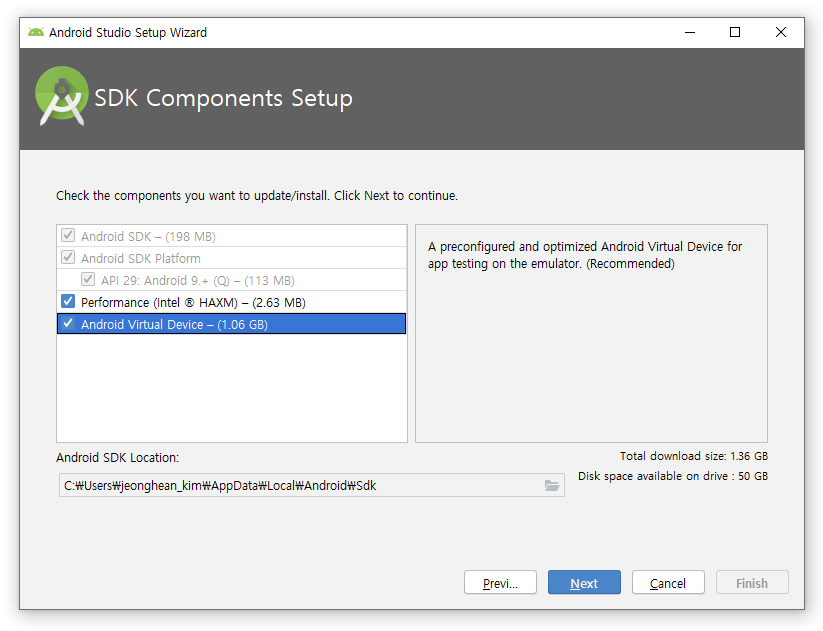 다음 화면으로 이동하면, 아래와 같이 SDK Components Setup 화면을 확인할 수 있습니다. Performance (Intel ® HAXM)와 Android Virtual Device를 선택하고 Next 버튼을 눌러 설치를 진행합니다.
