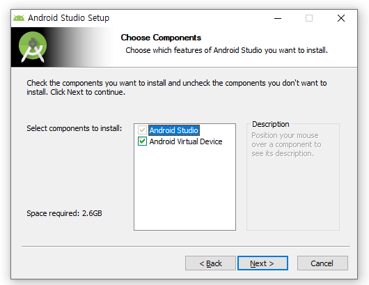 Next 버튼을 눌러 다음 화면으로 이동합니다. 다음 화면으로 이동하면 아래와 같이 Choose Components 화면이 나옵니다. Android Virtual Device를 선택하고 Next 버튼을 눌러 다음으로 진행합니다.