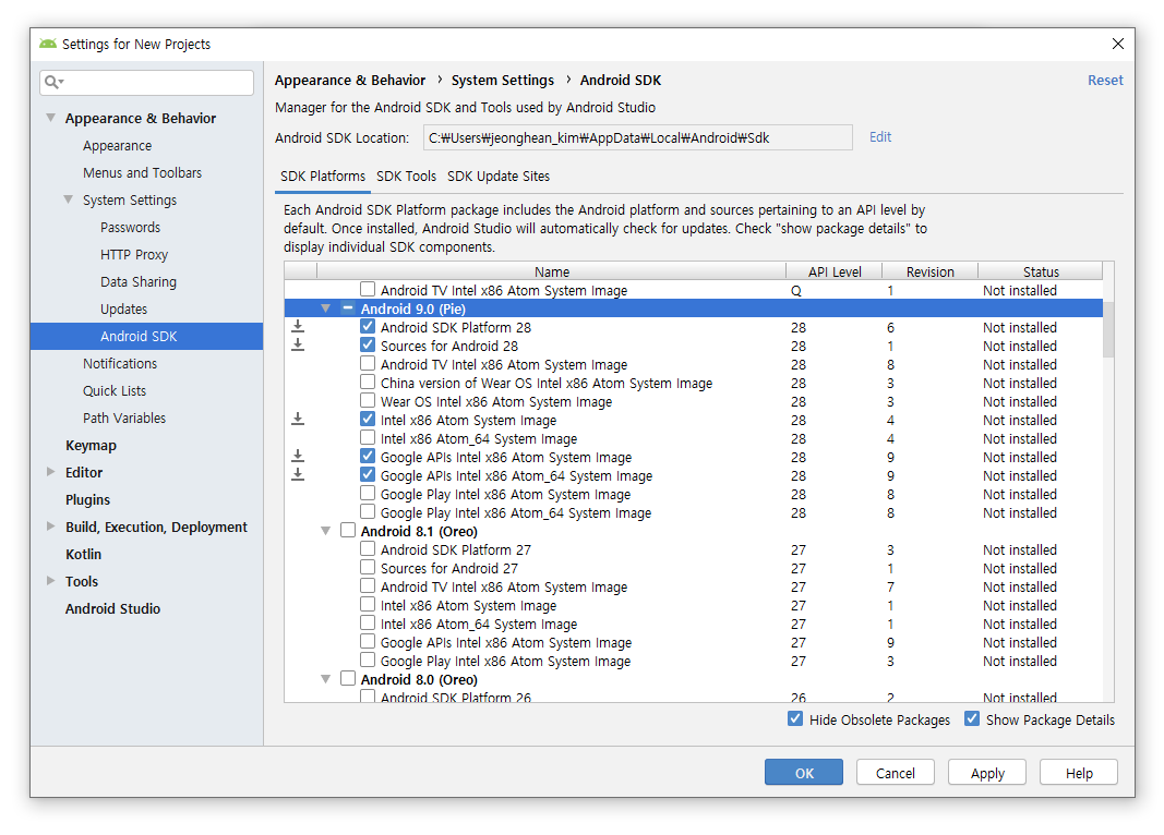 위와 같이 새 환경 변수 추가 화면이 나오면 변수 이름에는 ANDROID_HOME을 입력하고, 변수값에는 자신의 안드로이드 스튜디오의 SDK 위치를 입력합니다. 자신의 안드로이드 SDK 위치가 어디인지 모르는 경우, 아래와 같이 안드로이드 스튜디오 SDK 설정 화면으로 이동합니다. 안드로이드 스튜디오 SDK 설정 화면의 제일 상단을 보면 Android SDK Location 항목에서 자신의 안드로이드 SDK 위치를 확인할 수 있습니다.