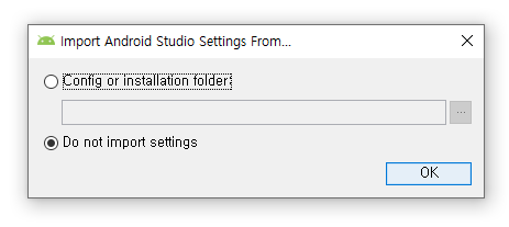 Finish 버튼을 눌러 안드로이드 스튜디오 설치를 완료하면, 아래와 같이 안드로이드 스튜디오가 실행됩니다. Do not import settings를 선택하고 OK 버튼을 눌러 안드로이드 스튜디오를 실행합니다.