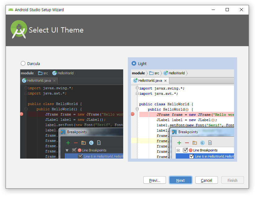 다음 화면으로 이동하면, 아래와 같이 Select UI Theme 화면을 확인할 수 있습니다. 자신이 좋아하는 테마를 선택하고 Next 버튼을 눌러 다음으로 진행합니다.