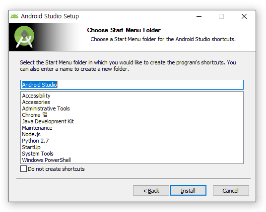다음 화면으로 이동하면, 아래와 같이 시작 메뉴를 설정하는 화면을 확인할 수 있습니다. 특별히 수정할 것 없이, Install 버튼을 눌러 설치를 진행합니다.