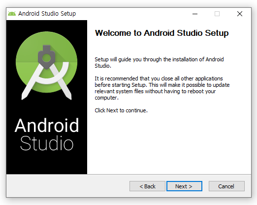 다운로드가 완료되면, 설치 파일을 실행하여 안드로이드 스튜디오를 설치를 진행합니다.