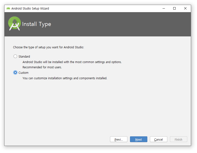 다음 화면으로 이동하면 아래와 같이 Install Type을 설정하는 화면이 나옵니다. Custom을 선택하고 Next 버튼을 눌러 다음으로 진행합니다.