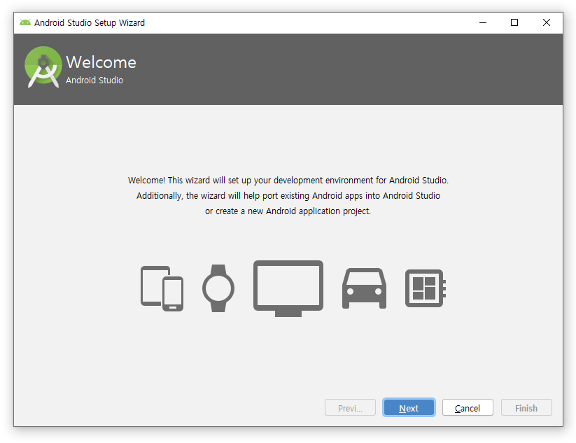 OK 버튼을 눌러 안드로이드 스튜디오를 실행하면, 아래와 같이 안드로이드 스튜디오 설정 위자드 화면을 확인할 수 있습니다. Next 버튼을 눌러 다음으로 진행합니다.