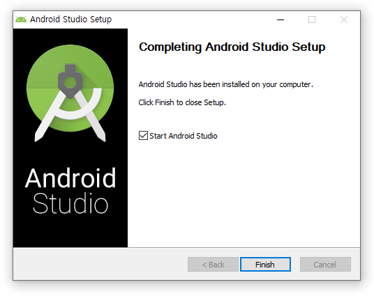 Next 버튼을 눌러 설치를 완료하면, 아래와 같은 화면을 볼 수 있습니다. Start Android Studio가 체크된 상태에서 Finish 버튼을 눌러 안드로이드 스튜디오 설치를 완료합니다.