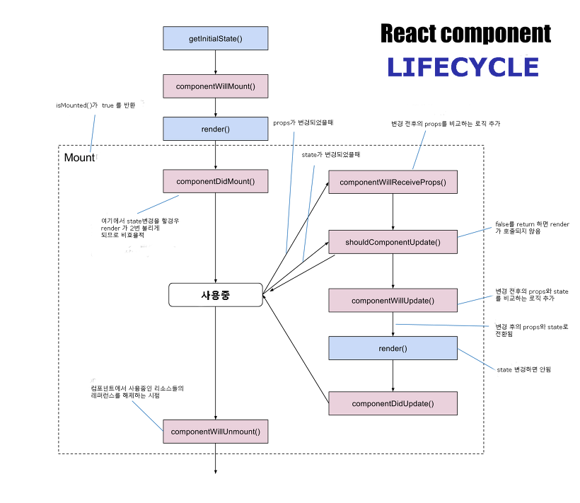 shouldComponetUpdate (false 시 업데이트 취소) ➡️ componetWillUpdate(depricated) ➡️ render ➡️ componetDidUpdate