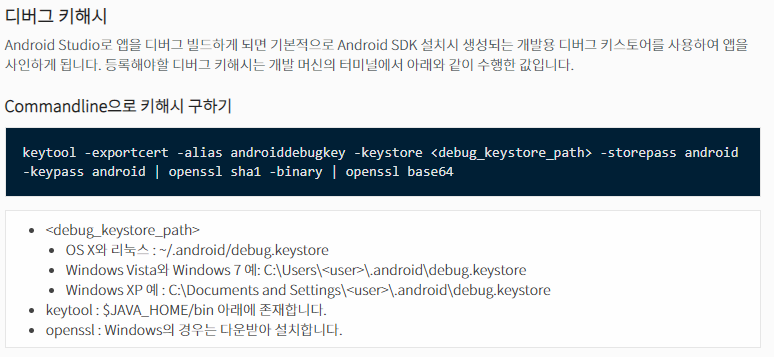 keytool -exportcert -alias androiddebugkey -keystore C:\Users\유저명\.android\debug.keystore -storepass android -keypass android | openssl sha1 -binary | openssl base64