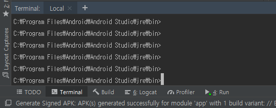 터미널탭으로 이동해 경로를 C:\Program Files\Android\Android Studio\jre\bin로 이동해주세요.