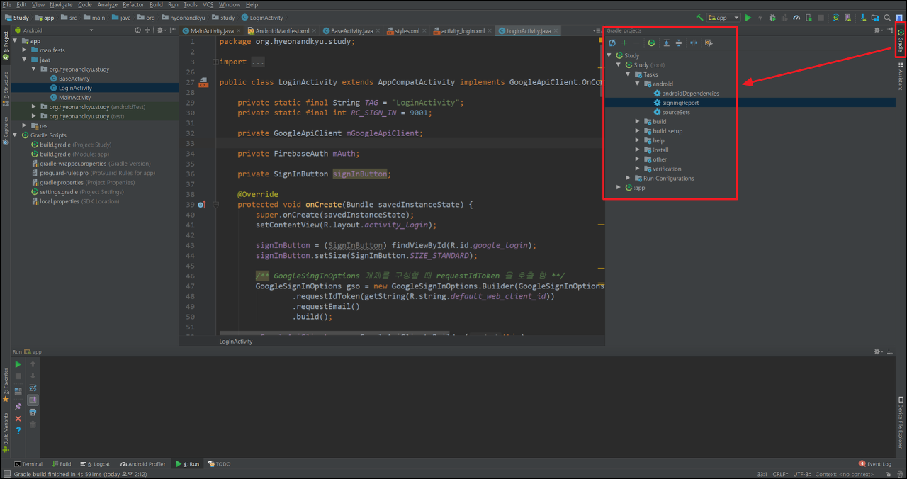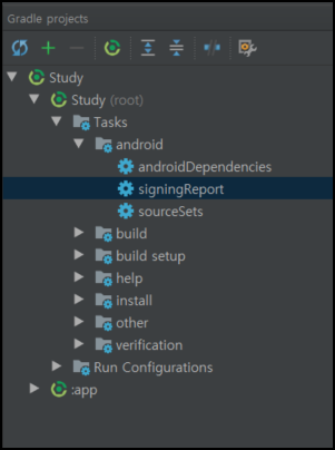 프로젝트 명 -> Tasks -> android -> signing Report를 더블 클릭합니다.