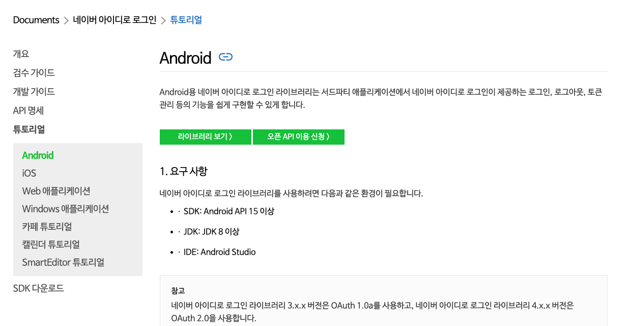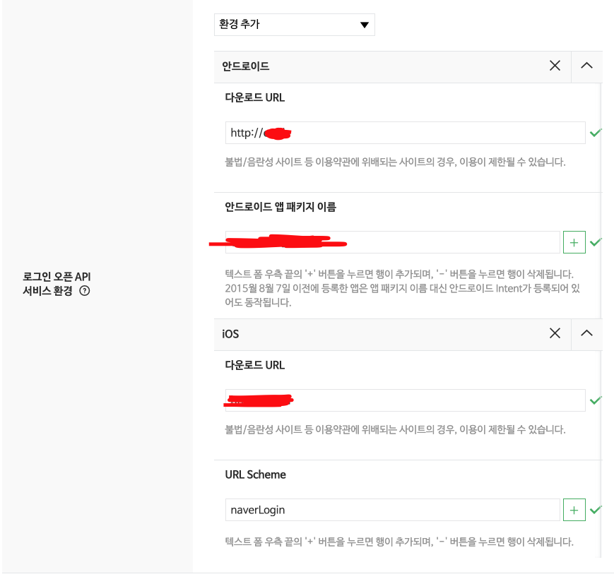 - 이후 로그인 오픈 API 서비스 환경에서 Android , Ios 를 추가한다.