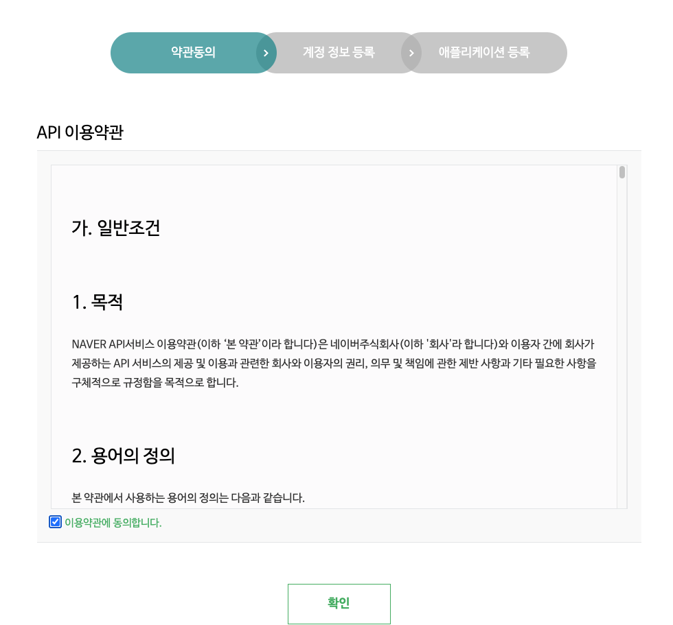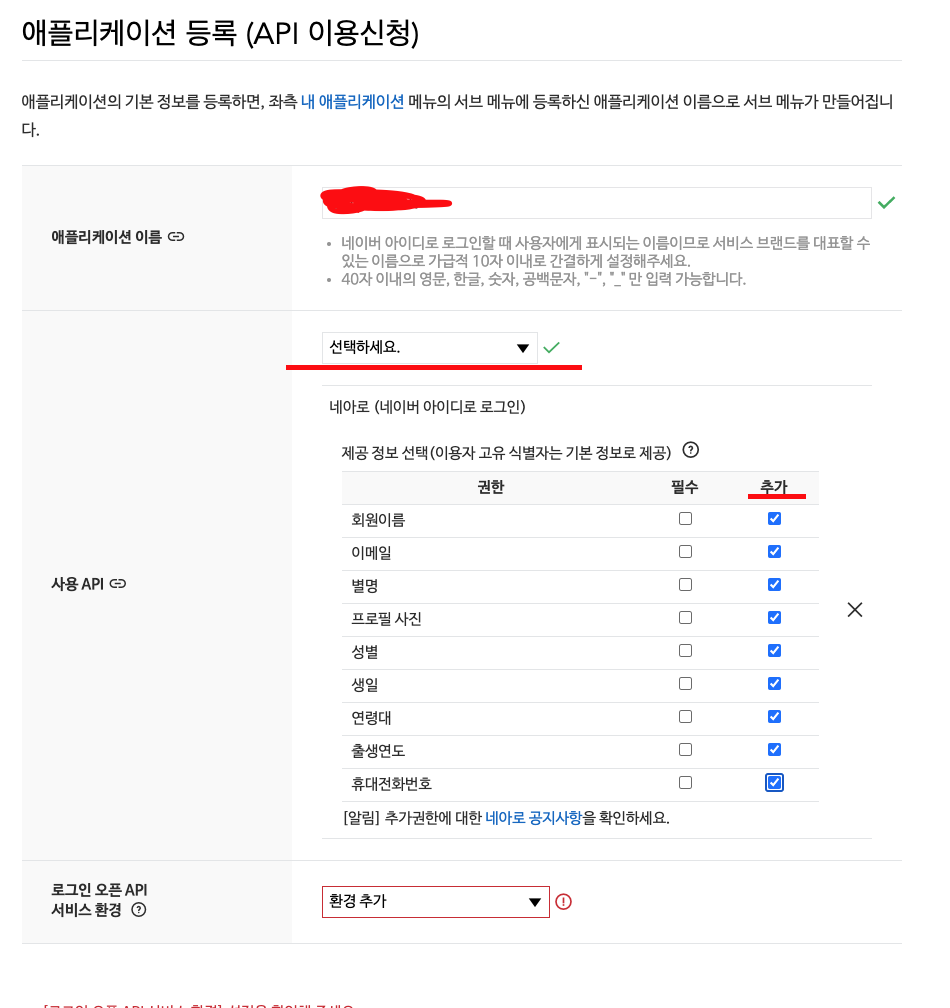 - 다음은 애플리케이션 이름을 입력하고 사용 API 부분에 사용하려는 기능을 선택한다.