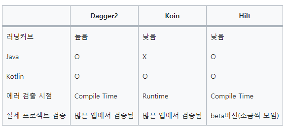 - 구글 문서도 빠르게 업데이트 중이고, 낮은 러닝커브와 Dagger의 장점을 모아 구글에서 만들어지고 있는 Framework