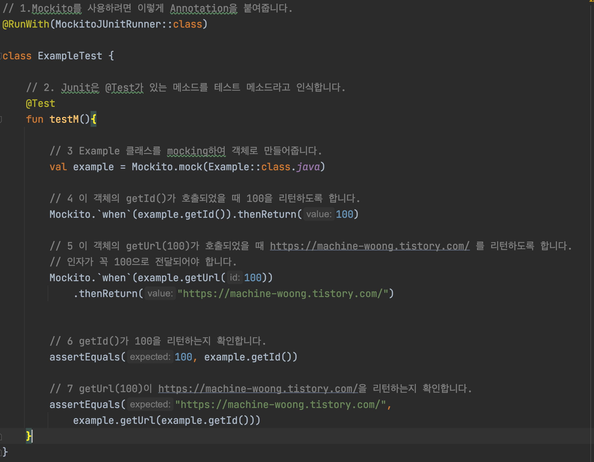 1. @RunWith(MockitoJUnitRunner::class) 를 선언