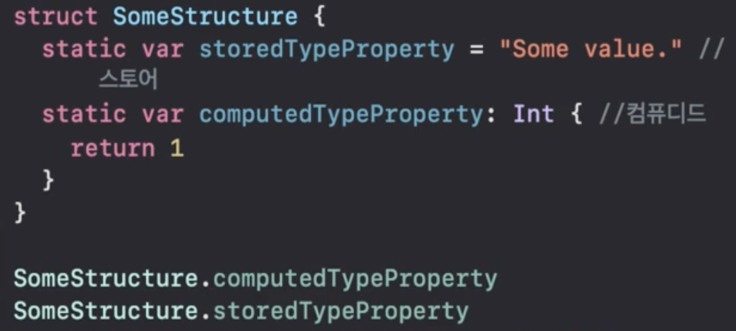 - 클래스 , 구조체, 열거형 등에 관련된 값 ( 인스턴스에 소속된 변수 및 속성 )