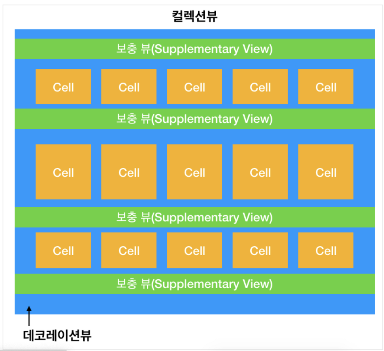 - 각 Cell 은 UICollectionViewCell 클래스의 인스턴스 또는 UICollectionViewCell 을 상속받은 클래스의 인스턴스 (커스터마이징 할 시)