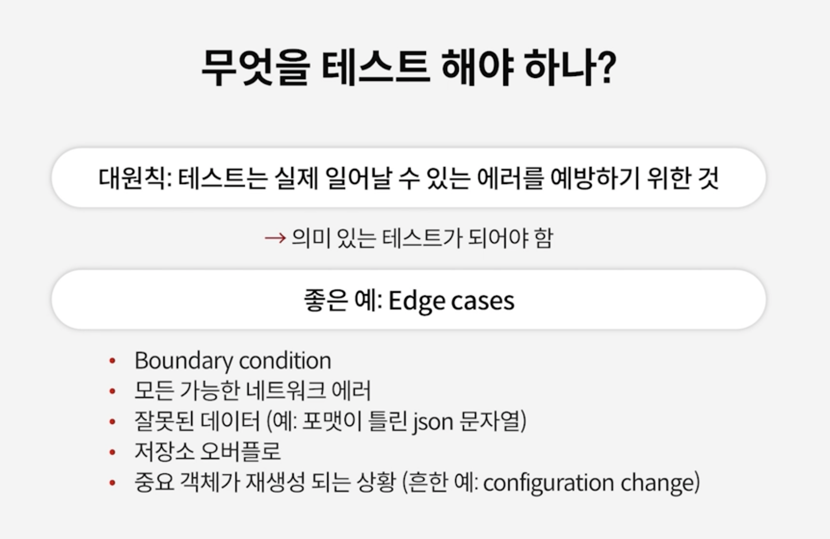 - 바운더리 컨디션 : 예를 들어 어떤 함수가 1부터 100 까지 받을 수 있다고 할때 0 을 넣어본다.