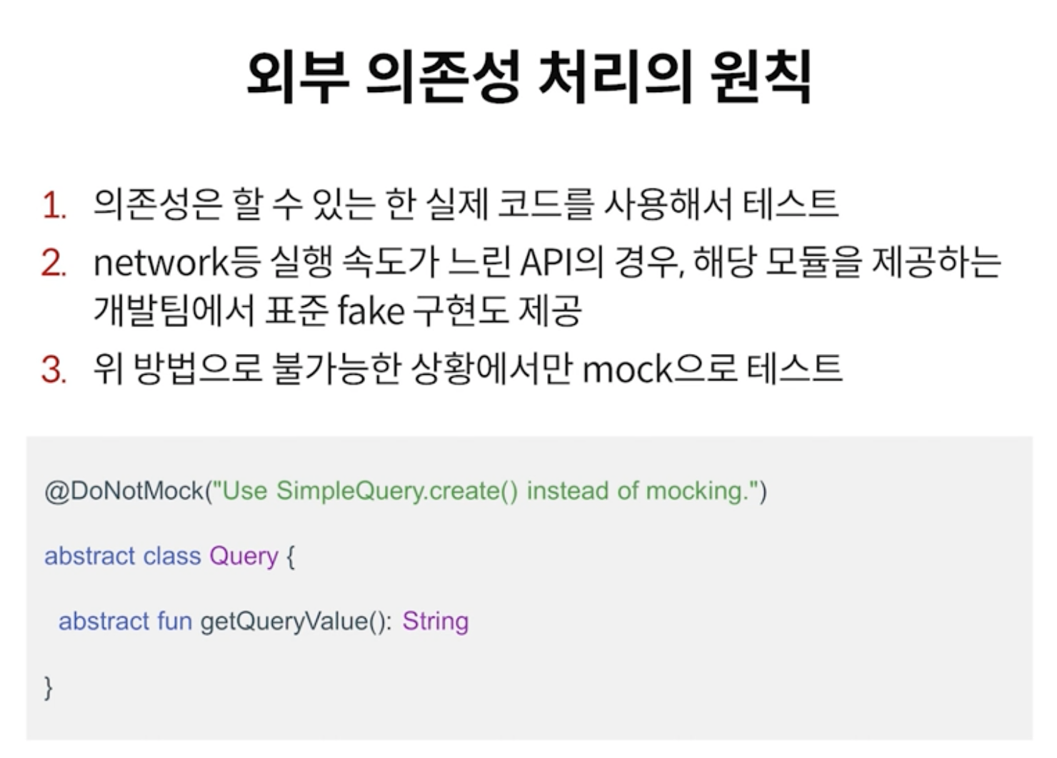* 왠만하면 실제코드를 사용하는 것이 좋다. 네트워크 관련된 경우, 인터넷이 끊기면 정상적인 테스트 코드도 fail이 날수 있기 때문이다