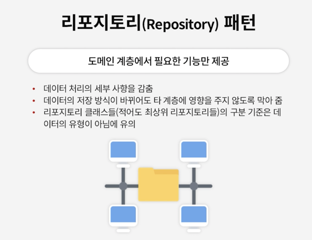 => 레포지토리란 ? 저장방식이 어떻게 되는지를 감쳐주는 역할을 한다.