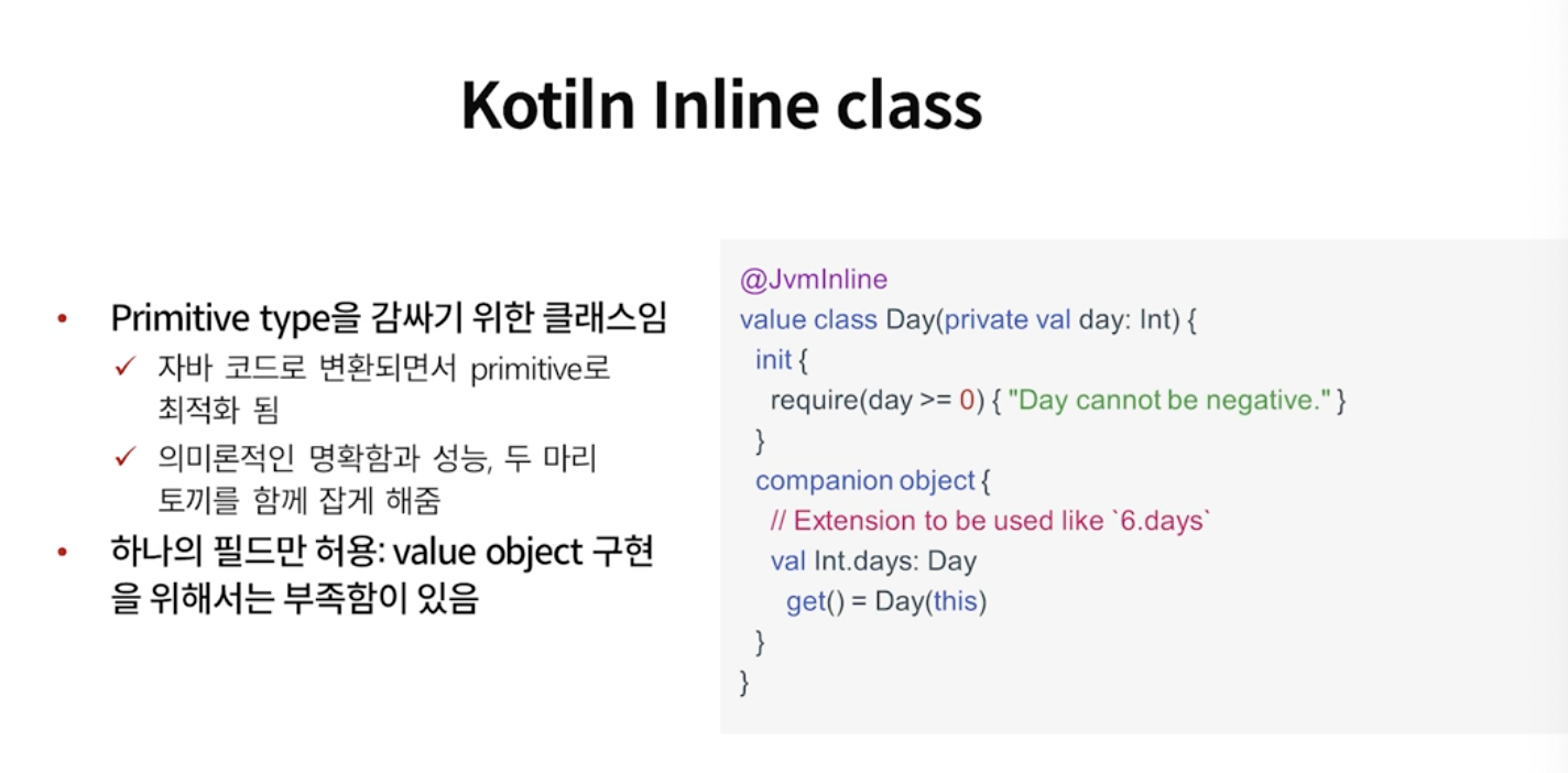 => 코틀린에서는 값객체를 이용한 패턴을위해 inline으로 지원해 준다.