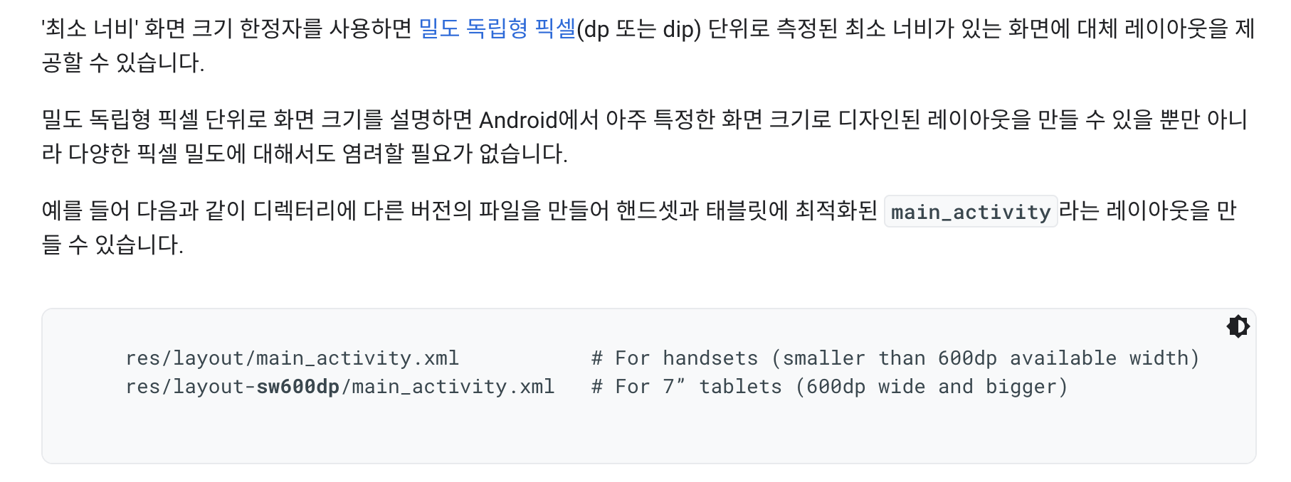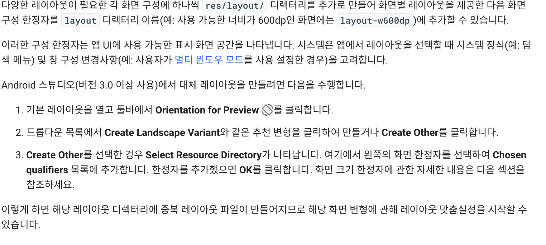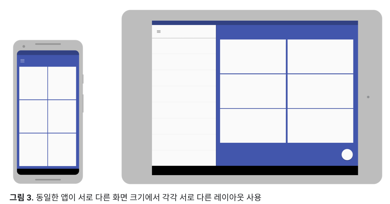 따라서 앱은 특정 화면 크기에 맞게 디자인된 UI를 최적화할 대체 레이아웃 리소스도 제공해야 합니다.