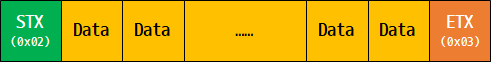 그렇기 때문에 데이터가 어느 시점에 시작하고 끝나는가를 알 수 있어야 합니다. 우선 시작을 의미하는 값을 데이터를 보내기 전에 추가합니다. 일반적으로 STX(0x02, Start of Text)를 사용합니다. 데이터의 말단에는 끝을 의미하는 값을 추가합니다. 일반적으로 ETX(0x03, End of Text)를 사용합니다. 이런 구조로 데이터 덩어리(패킷)를 만들어 통신한다면 데이터의 길이에 상관없이 정확히 데이터의 시작과 끝을 알 수 있습니다. 이때 사용하는 STX나 ETX를 두고 '전송 제어 문자'라고 합니다.