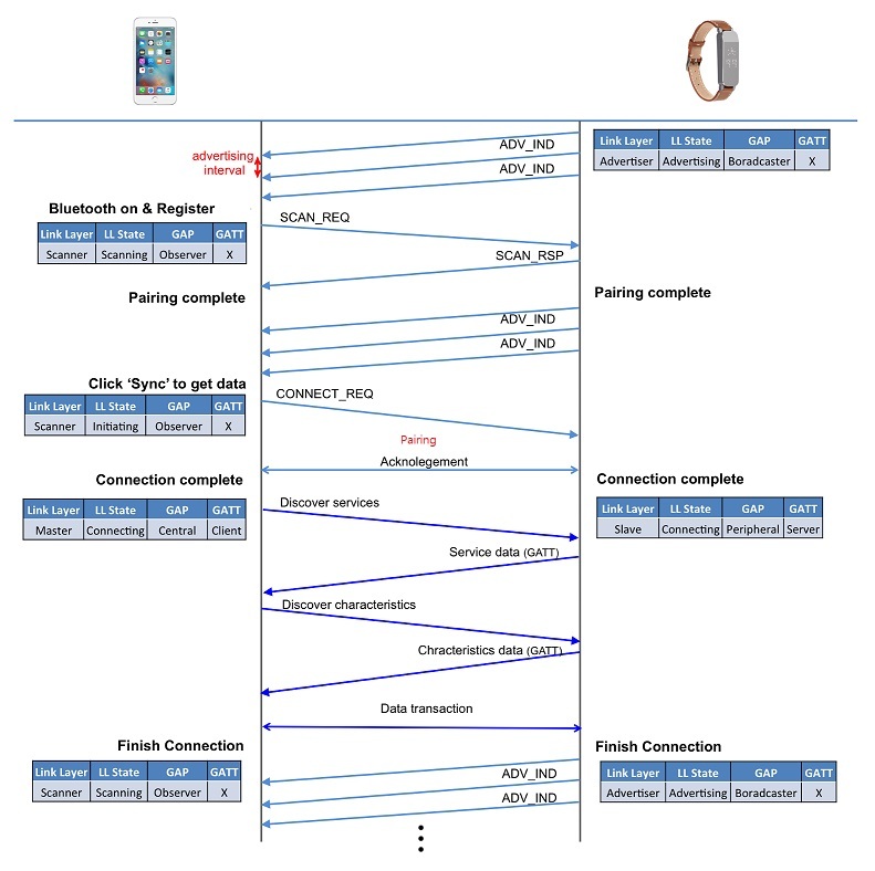 연결이 되고 나면 Central 디바이스는 *timing을 설정하고 주기적인 데이터 교환을 주도한다.