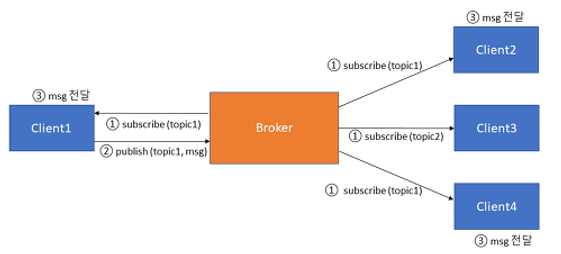 Broker는 Publisher가 발행한 Topic을 가지고 있고, Subscriber(구독자)는 Topic 기준으로 Broker에 구독을 요청합니다.