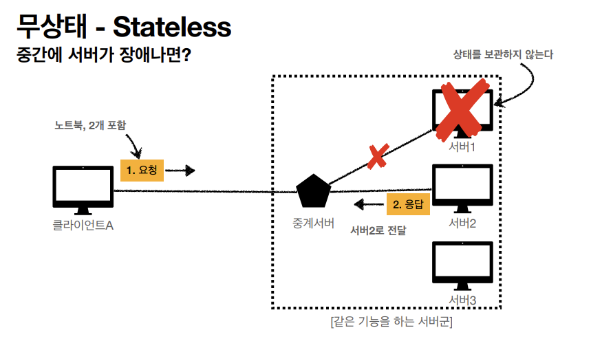 서버가 클라이언트의 연결/상태 정보를 보존하지 않는다. 즉, 클라이언트가 이전 요청과 같은 데이터를 원한다고 하더라도 다시 서버에 동일한 요청을 해야 한다. 클라이언트가 이전에 자신이 요청한 정보를 저장해놓고 해당 정보를 다시 보내주므로, 클라이언트의 요청에 어떤 서버가 응답해도 상관이 없어서 서버 확장성이 높은 장점이 있는 반면, 클라이언트가 많은 양의 추가 데이터를 전송해야 하는 단점이 있다. 하지만 로그인 같은 상태 정보는 서버에 유지시켜야 하는데 이 경우 브라우저 쿠키나 세션 등을 이용해 상태를 유지해야 한다.