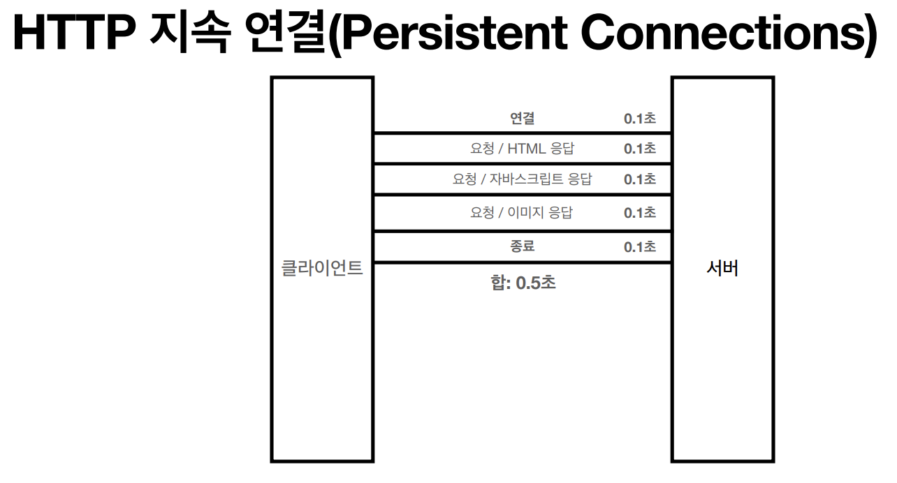 해결: HTTP 지속연결(Persisten Connections)을 통해 이를 해결. 처음 연결이 되고 나서, 여러 파일의 요청/응답이 다 끝난 뒤 연결을 종료한다.