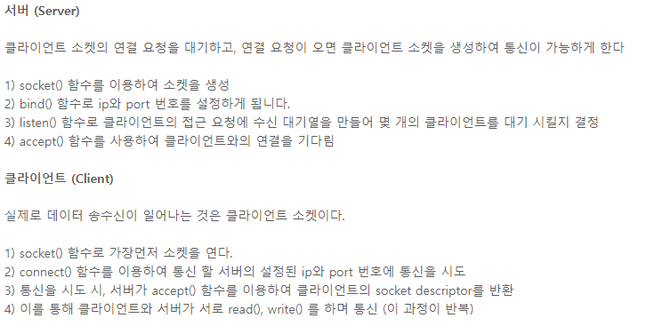 서버와 클라이언트 간 통신을 하기 위해서는 운영체제에 socket() 시스템콜을 통해 소켓을 생성.