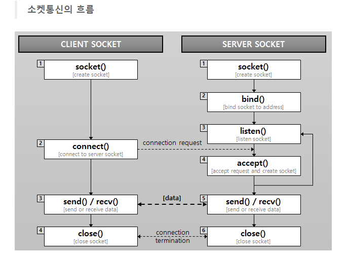 TCP/IP 소켓 통신 TCP/IP 소켓통신 과정 설명 클라이언트 소켓과 서버 소켓으로 구분되어짐 클라이언트 소켓 통신 과정 [1. 소켓을 생성] 클라이언트와 특정 서버와 통신을 하기 위해서는 운영체제