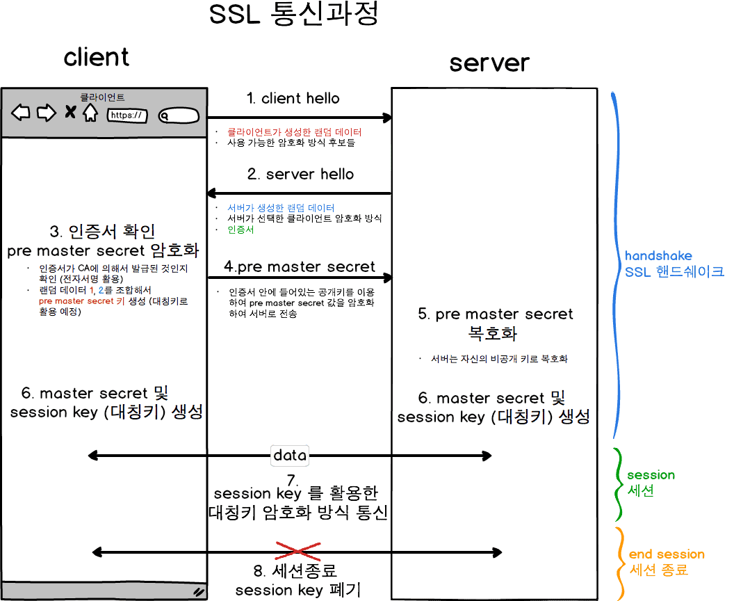 - 그렇기 때문에 SSL 핸드쉐이킹 과정에서는세션이 형성 된 후에는 대칭키 방식으로 효율을 높혔다.