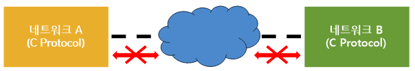 - 네트워크 A, B가 존재하며 각각 내부에서만 사용되는 C Protocol을 사용한다. (두 Protocol은 동일하며, 인터넷 망에서는 사용 불가능하다고 가정)