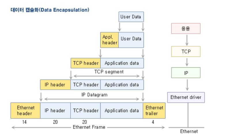 여기서 헤더를 추가하는 과정, 필요한 데이터를 추가해 나가는 과정을 캡슐화 ( encapsulation )이라고 함.