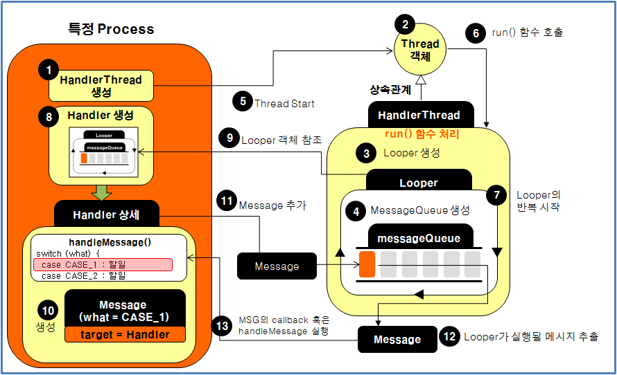 7번과 같이 Looper가 계속 반복하여 MessageQueue에 메시지를 꺼내가려고 할 것이다.