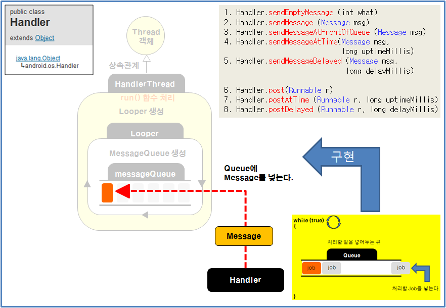 위에 1~8번의 Handler Class의 함수를 사용하여 Queue에 메시지를 넣게 된다.